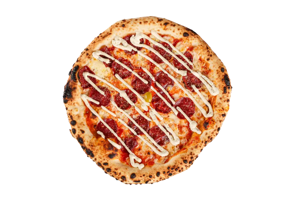 Pelati, fior di latte, kulen, mozzarella di bufala, oliva.